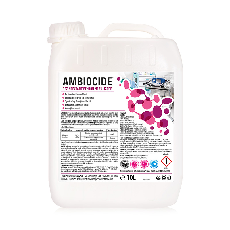 AMBIOCIDE® – Dezinfectant MICROAEROFLORA‚ RTU este utilizat pentru dezinfectarea aerului din incaperi. Este un aparat special conceput (nebulizator), in care se introduce cantitatea necesara de produs, calculata in functie de volumul incaperii.