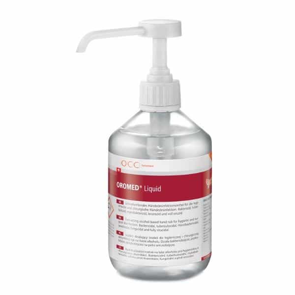 Dezinfectant Lichid pentru Maini – OCC Switzerland Oromed Liquid, 500ml: dezinfectant pe baza de alcool pentru dezinfectia igienica si chirurgicala a mainilor si antebratelor, cu un larg spectru antimicrobian si o formula lejera, limpede si textura nelipicioasa, cu uscare rapida. Contine vitamine si ingrediente antioxidante, calmante, hidratante si emoliente ce previn uscarea, iritatiile si imbatranirea cutanata prematura si protejeaza chiar si pielea sensibila impotriva efectelor nedorite ale utilizarii frecvente, lasand mainile curate si catifelate. Nu contine parfumuri sau coloranti si are efect bactericid, levuricid, tuberculocid, micobactericid si virucid. Testat dermatologic, conform standardelor europene. Domenii de aplicare: medical, dentar, veterinar, cosmetic (saloane, centre de infrumusetare), farmaceutic, transporturi, restaurante, colectivitati (azile, unitati de invatamant, magazine, sali de fitness) etc.