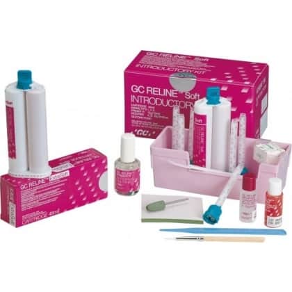 GC Reline Soft Intro Pack – 1 Cartus 62g, 1 x Primer R 12g , Varfuri mixare tip 2L, sticlute Reline Modifier Parts A si B (10g ea.), con curatare, disc finisare, perie nr.7, spatula plastic, pad mixare, bulete.