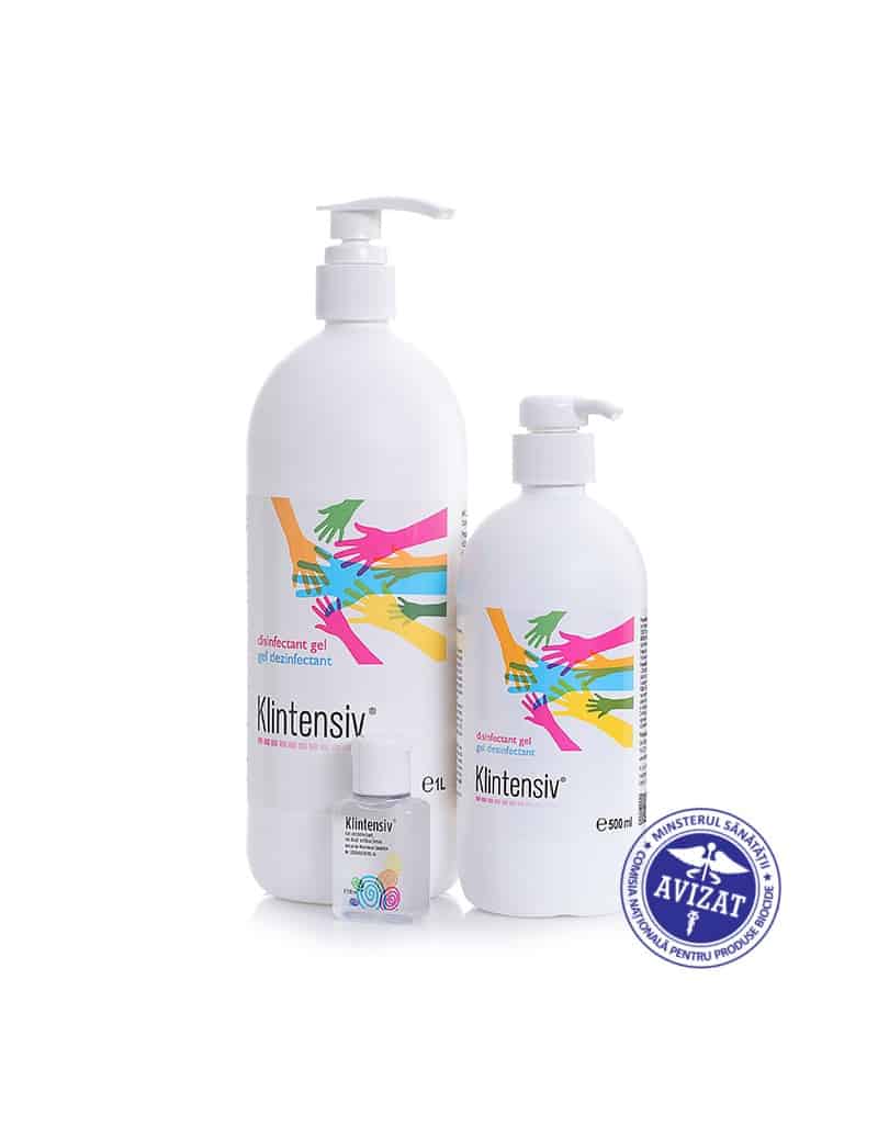 Modalitati de ambalare: Gel dezinfectant maini Klintensiv 28 ml, 55 ml, 80 ml, 500 ml, 1000 ml, 5000 ml.