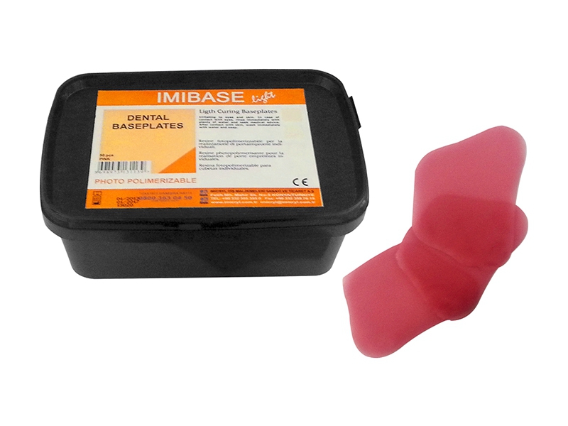 PLĂCILE DE BAZĂ IMIBASE LIGHT CURE sunt o componentă, material fotopolimerizabil personalizat pentru tavi, furnizate în napolitană preformată. IMIBASE oferă o tavă personalizată fermă, stabilă, care este gata de utilizare imediat după tundere și lustruire. Datorită naturii fotopolimerizabile și consistenței chitului, adăugarea sau scăderea materialului se face ușor. Plăcile prefabricate pot fi ușor formate, adaptate și tăiate. IMIBASE inodor se intareste rapid si ofera un timp de lucru confortabil la lumina normala de laborator. În plus, IMIBASE se remarcă prin grosimea sa uniformă a stratului. Tava personalizată finită poate fi utilizată imediat, fără a necesita o polimerizare îndelungată